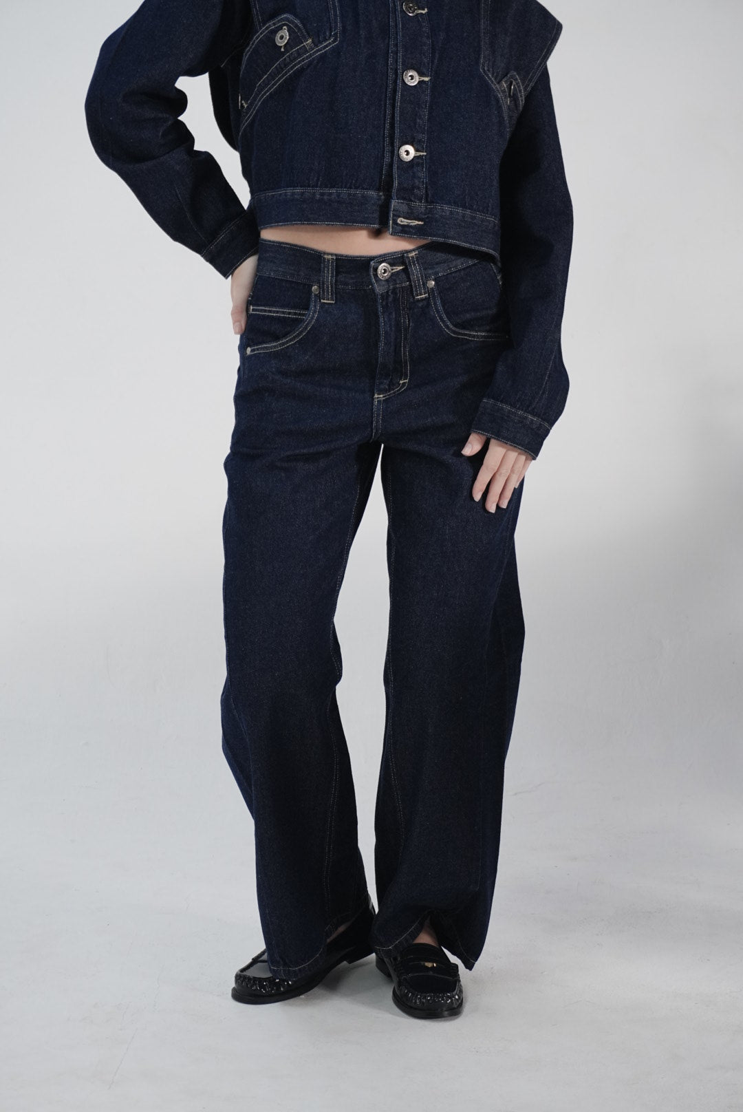 Pantalón de denim con tiro medio y pierna ancha. Fit relajado, caída limpia,